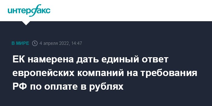 "Мы находимся в контакте с предприятиями и государствами-членами, которые могут быть этим затронуты, чтобы дать единый ответ на эти российские требования, выдвинутые с целью обойти наши ограничительные меры", - сообщил представитель ЕК.