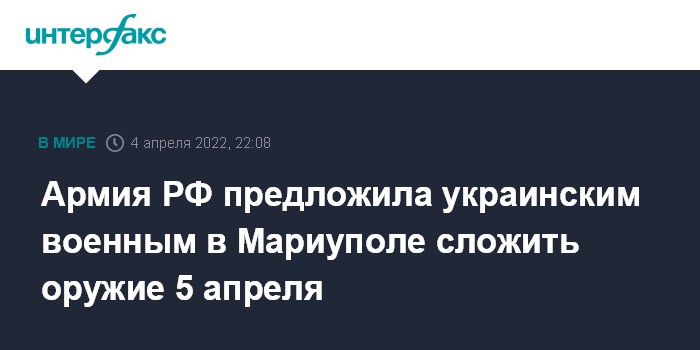 Москва. 4 апреля. INTERFAX.RU - Минобороны РФ предложило украинским формированиям в Мариуполе 5 апреля сложить оружие и пообещало сохранить их жизни.