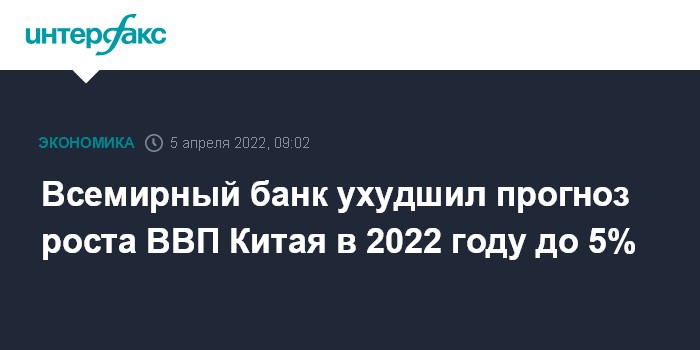 Москва. 5 апреля. INTERFAX.RU - Всемирный банк ухудшил прогноз роста ВВП Китая по итогам 2022 года. Базовый сценарий теперь предполагает рост экономики на 5% вместо прежде ожидавшихся 5,4%.