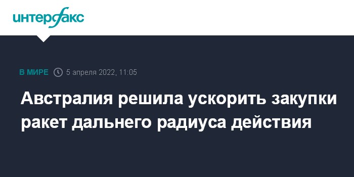 Москва. 5 апреля. INTERFAX.RU - Власти Австралии приняли решение закупить ракеты дальнего радиуса действия для самолетов и кораблей на годы раньше, чем планировалось ранее, сообщило во вторник издание South China Morning Post (SCMP).