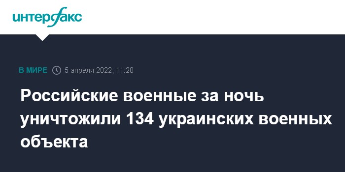 Москва. 5 апреля. INTERFAX.RU - Российские военные за ночь уничтожили 134 украинских военных объекта, сообщил официальный представитель Минобороны РФ Игорь Конашенков.