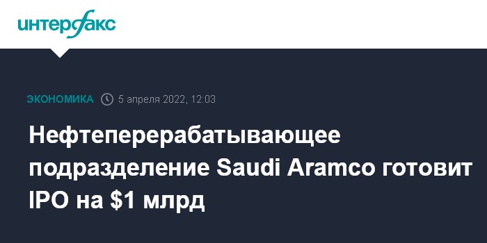 Москва. 5 апреля. INTERFAX.RU - Saudi Aramco Base Oil Co., нефтеперерабатывающее подразделение саудовской госкомпании Saudi Aramco, планирует провести IPO, в ходе которого может привлечь свыше $1 млрд, сообщает Bloomberg со ссылкой на источники.