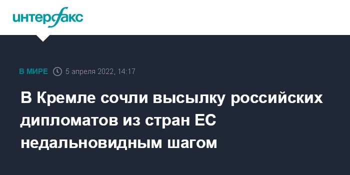Москва. 5 апреля. INTERFAX.RU - Массовая высылка российских дипломатов из европейских стран в нынешних кризисных условиях является недальновидным шагом, который не останется без ответа, заявил пресс-секретарь президента РФ Дмитрий Песков.