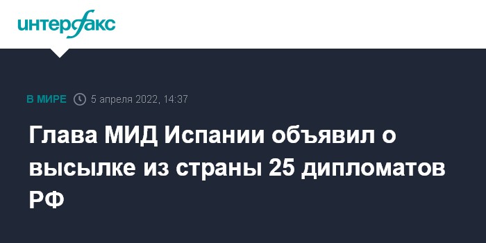 Москва. 5 апреля. INTERFAX.RU - Внешнеполитическое ведомство Испании во вторник приняло решение выслать из страны 25 российских дипломатов, сообщает испанская радиостанция Cadena SER.