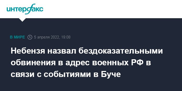 Москва. 5 апреля. INTERFAX.RU - Обвинения в адрес российских военных на Украине, в частности, в Буче, являются огульными и бездоказательными. Об этом заявил постпред РФ при ООН Василий Небензя.