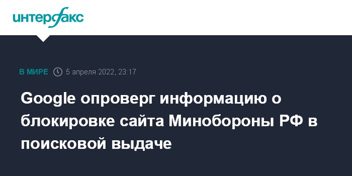 Москва. 5 апреля. INTERFAX.RU - Google не блокирует в выдаче своего поисковика ссылку на сайт Минобороны России, заявили "Интерфаксу" в пресс-службе компании.