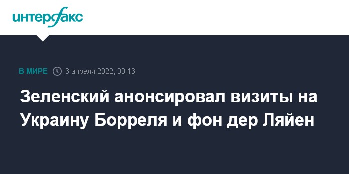 Москва. 6 апреля. INTERFAX.RU - В Киеве ожидают визита главы Еврокомиссии Урсулы фон дер Ляйен и высокого представителя ЕС по внешней политике и безопасности Жозепа Борреля, сообщил в видеообращении в ночь на среду президент Украины Владимир Зеленский.