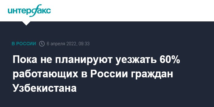 Москва. 6 апреля. INTERFAX.RU - Опрос работающих в России граждан Узбекистана показал, что 60% из них пока не намерены возвращаться домой, сообщил на пресс-конференции заместитель начальника Агентства по внешней трудовой миграции при Министерстве занятости и трудовых отношений республики Азизбек Юнусов.