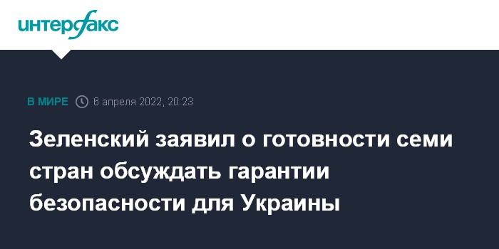 Москва. 6 апреля. INTERFAX.RU - Советники лидеров семи стран, среди которых США, Великобритания, Турция, Польша, Германия, Франция и Израиль, готовы обсуждать список гарантий безопасности для Украины, заявил украинский президент Владимир Зеленский.