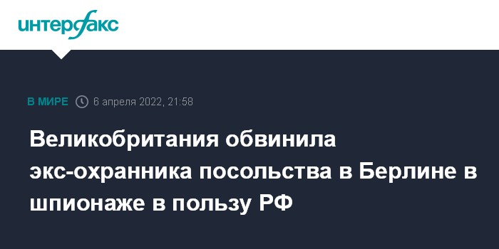 Москва. 6 апреля. INTERFAX.RU - В Великобритании предъявили обвинение в шпионаже в пользу России бывшему охраннику британского посольства в Берлине, сообщает в среду агентство Associated Press.