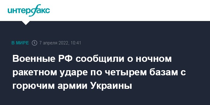 Москва. 7 апреля. INTERFAX.RU - Министерство обороны России сообщило, что высокоточными ракетами с самолетов и кораблей уничтожены четыре базы горюче-смазочных материалов армии Украины.