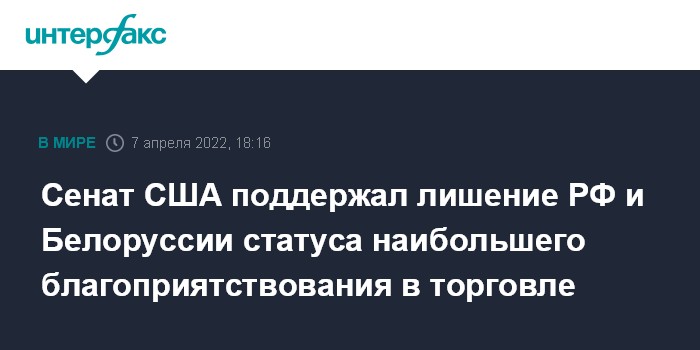 Сенат США поддержал лишение РФ и Белоруссии статуса наибольшего благоприятствования в торговле