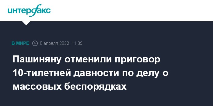 Москва. 8 апреля. INTERFAX.RU - Кассационный суд Армении на заседании в пятницу вынес оправдательное решение в пользу действующего премьер-министра республики Никола Пашиняна, который в 2010 году был осужден на семь лет по обвинению в организации массовых беспорядков.