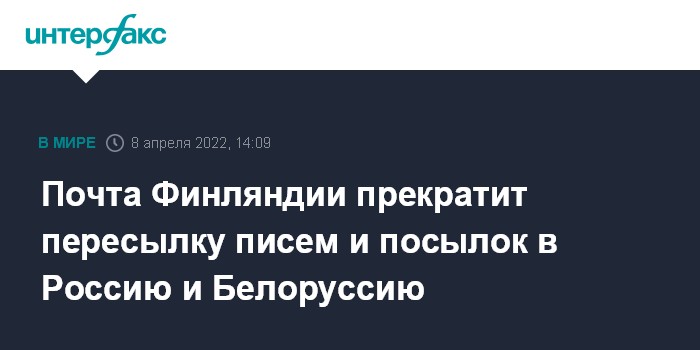 Москва. 8 апреля. INTERFAX.RU - Государственный почтовый оператор Финляндии Posti сообщил, что с 11 апреля прекратит пересылку любых писем и посылок между Финляндией и Россией, а также между Финляндией и Белоруссией.