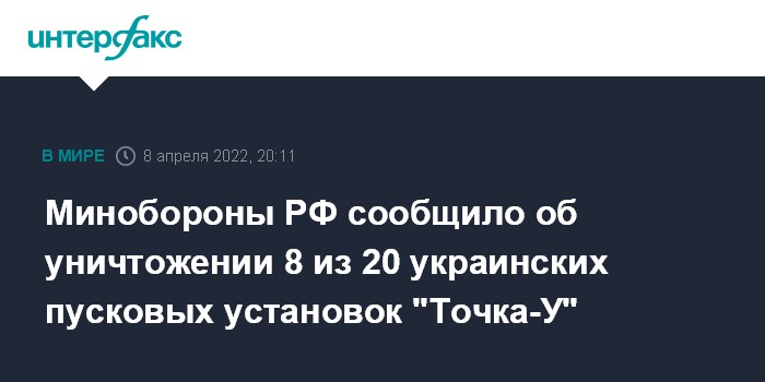 Москва. 8 апреля. INTERFAX.RU - Российские Вооружённые силы в ходе проведения специальной военной операции уничтожили восемь украинских пусковых установок "Точка-У" и около 90% ракет на арсеналах, сообщил официальный представитель министерства обороны РФ Игорь Конашенков на брифинге в пятницу.
