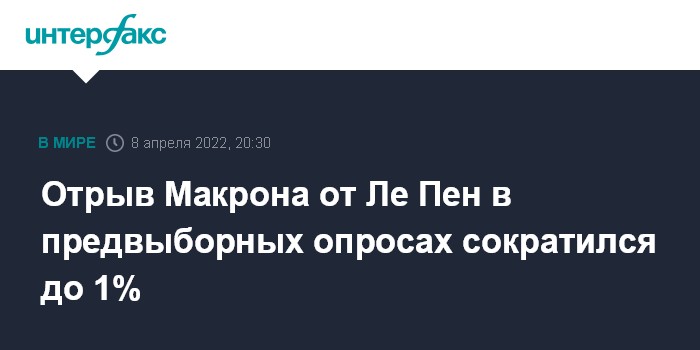 Москва. 8 апреля. INTERFAX.RU - Президент Франции Эммануэль Макрон по-прежнему остается лидером в предвыборной гонке, но за несколько дней до выборов его отрыв от лидера ультраправой партии "Национальное объединение" значительно уменьшился, свидетельствуют результаты опроса Elabe для телеканала BFMTV.