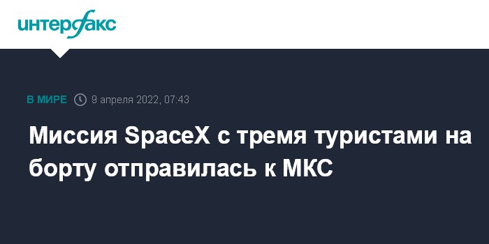 Москва. 9 апреля. INTERFAX.RU - Компания SpaceX 8 апреля отправила трех туристов на Международную космическую станцию (МКС) в рамках тура, организованного фирмой Axiom Space. Об этом пишет Associated Press.