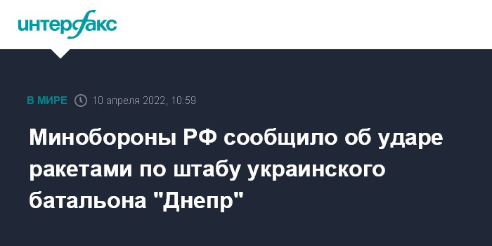 Москва. 10 апреля. INTERFAX.RU - Российские военные заявили, что ночью нанесли ракетный удар по штабу украинского батальона "Днепр" в Днепропетровской области.