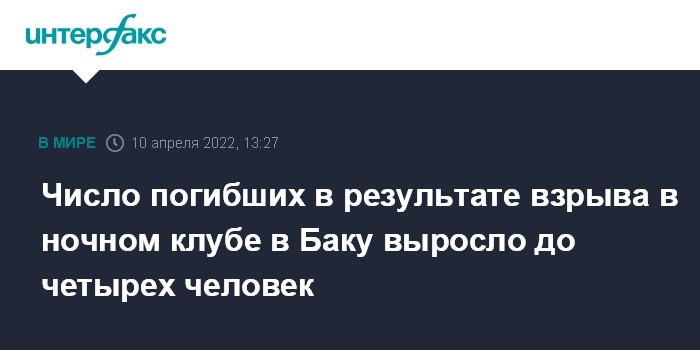 Москва. 10 апреля. INTERFAX.RU - Скончалась одна из пострадавших при взрыве в ночном клубе Location в Баку в ночь на 3 апреля, таким образом число погибших в результате инцидента выросло до четырех человек. Об этом в воскресенье сообщили информационному агентству "Интерфакс-Азербайджан" в генеральной прокуратуре Азербайджана.