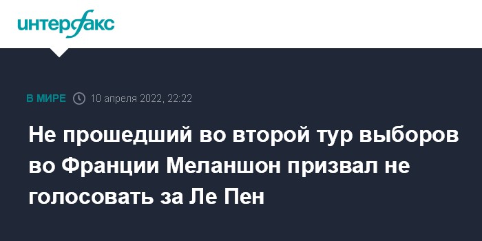 Москва. 10 апреля. INTERFAX.RU - Пришедший третьим по итогам первого тура выборов президента Франции Жан-Люк Меланшон призвал сторонников во втором туре не отдавать голоса за кандидата от ультраправых Марин Ле Пен.