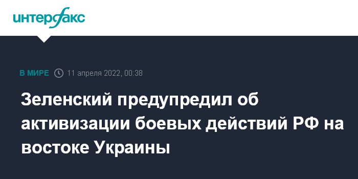 Москва. 11 апреля. INTERFAX.RU - Президент Украины Владимир Зеленский полагает, что в ближайшее время на востоке страны развернутся масштабные боевые действия, к которым следует быть готовыми.