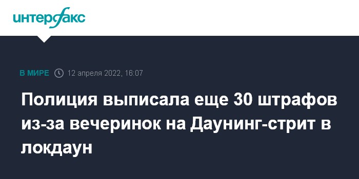 Москва. 12 апреля. INTERFAX.RU - Полиция Лондона выпишет еще 30 штрафов за нарушения на вечеринках в офисе премьер-министра и правительства на Даунинг-стрит и Уайтхолле во время локдауна в пандемию, сообщает ВВС.