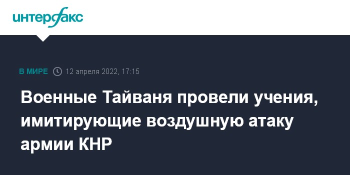 Москва. 12 апреля. INTERFAX.RU - Тайванские военные во вторник приняли участие в учениях по всему острову, которые имитировали воздушную атаку на Тайвань со стороны Народно-освободительной армии Китая, сообщает издание South China Morning Post (SCMP).