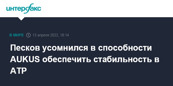 Москва. 13 апреля. INTERFAX.RU - Пресс-секретарь президента РФ Дмитрий Песков высказал скептическое отношение к возможностям альянса AUKUS, в который входят США, Великобритания и Австралия, обеспечить стабильность и безопасность в Азиатско-Тихоокеанском регионе.