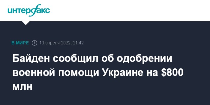Москва. 13 апреля. INTERFAX.RU - Президент США Джо Байден в среду заявил, что одобрил пакет помощи Украине в области безопасности на сумму $800 млн, включающий артиллерийские системы, бронетранспортеры и вертолеты.