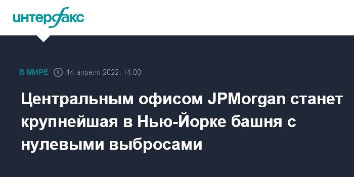 Москва. 14 апреля. INTERFAX.RU - Новым центральным офисом американского банка JPMorgan Chase & Co на Манхэттене станет крупнейшая в Нью-Йорке башня с нулевыми вредными выбросами.