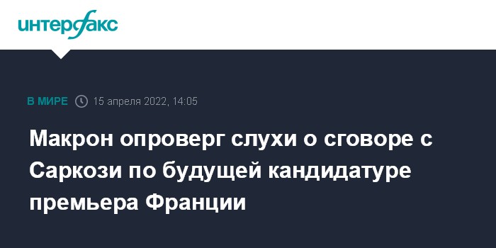 Москва. 15 апреля. INTERFAX.RU - Действующий президент Франции Эммануэль Макрон и фаворит президентских выборов 2022 года приветствовал поддержку со стороны бывшего главы государства Николя Саркози, но опроверг сообщения о "секретном пакте" между ними, в соответствии с которым экс-президент в обмен якобы сможет рекомендовать ему кандидатуру премьера.