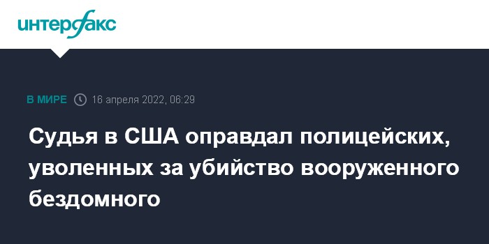 Москва. 16 апреля. INTERFAX.RU - Судья из Северной Калифорнии постановил, что пятеро полицейских Окленда, которые смертельно ранили бездомного мужчину в 2018 году, были несправедливо уволены и должны были сохранить свои рабочие места, сообщает ABC News.