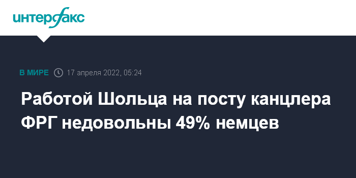 Москва. 17 апреля. INTERFAX.RU - Работой Олафа Шольца на должности канцлера ФРГ недовольны 49% жителей Германии, федеральным правительством недовольны 55% немцев, сообщает Bild am Sonntag со ссылкой на еженедельный опрос института исследования общественного мнения INSA.