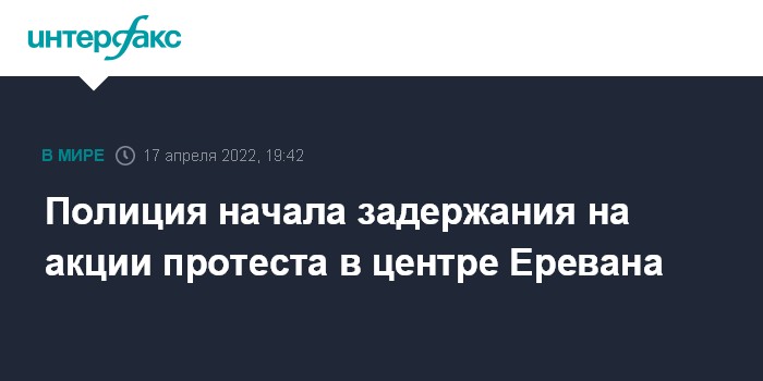 Москва. 17 апреля. INTERFAX.RU - Полиция Армении начала задержание граждан, собравшихся на площади Свободы в центре Еревана по призыву руководителя оппозиционной партии "Отечество", главы парламентской фракции "Честь имею", экс-директора Службы национальной безопасности Армении Артура Ванецяна.