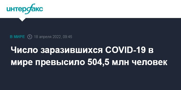 Москва. 18 апреля. INTERFAX.RU - Число зарегистрированных случаев заражения коронавирусом в мире на утро понедельника достигло 504 млн 577 тыс., свидетельствуют данные американского университета Джонса Хопкинса.
