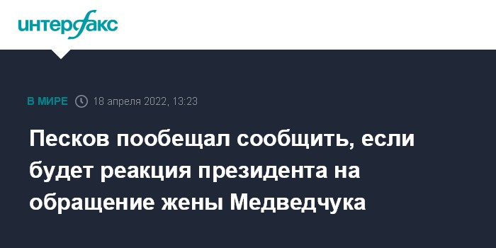 Москва. 18 апреля. INTERFAX.RU - Пресс-секретарь президента РФ Дмитрий Песков заявил, что в Кремле своевременно проинформируют СМИ в случае, если глава российского государства отреагирует на обращение супруги задержанного на Украине политика Виктора Медведчука.
