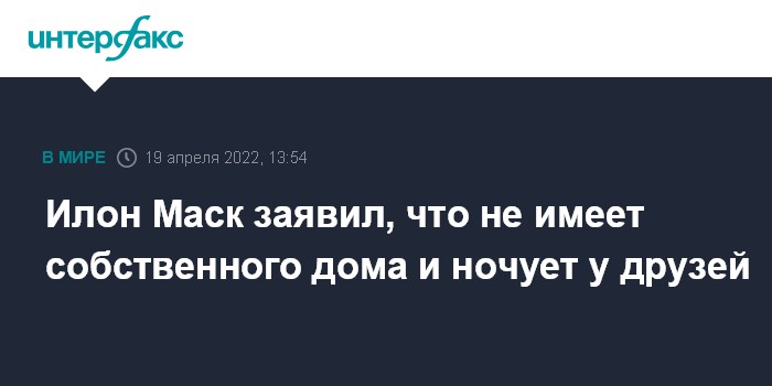 Москва. 19 апреля. INTERFAX.RU - Самый богатый человек в мире, глава Tesla Inc Илон Маск завил, что не имеет собственного дома и по большей части ночует у друзей. Он рассказал об этом в интервью журналисту издания TED Крису Андерсону.