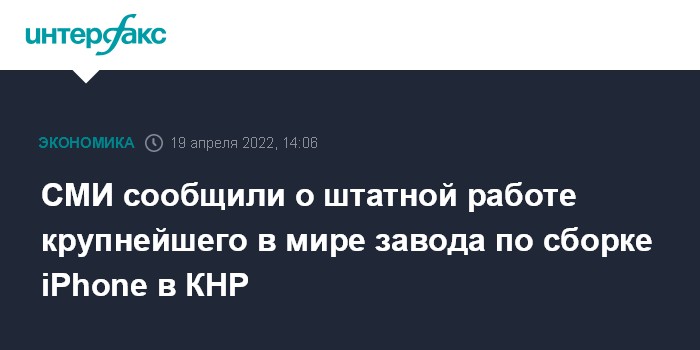 Москва. 19 апреля. INTERFAX.RU - Крупнейший в мире производственный комплекс по сборке смартфонов iPhone компании Apple Inc. в городе Чжэнчжоу работает в обычном режиме, несмотря на локдауны и массовое тестирование на COVID-19 в провинции Хэнань, сообщила местная газета Henan Daily.