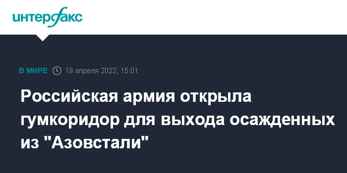 "С 14:00 мск 19 апреля Вооруженные силы России открыли гуманитарный коридор для вывода добровольно сложивших оружие украинских военнослужащих и боевиков националистических формирований", - сказал начальник Национального центра управления обороной РФ Михаил Мизинцев.