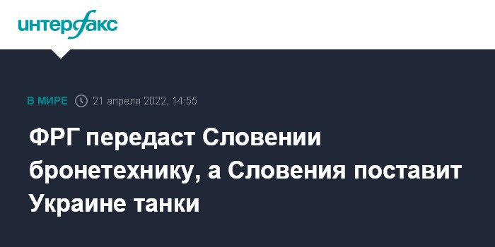 Москва. 21 апреля. INTERFAX.RU - Словения передаст Украине советские танки T-72, взамен Германия поставит Словении боевые машины пехоты Marder и бронетранспортеры Fuchs, сообщает немецкое информагентство DPA.