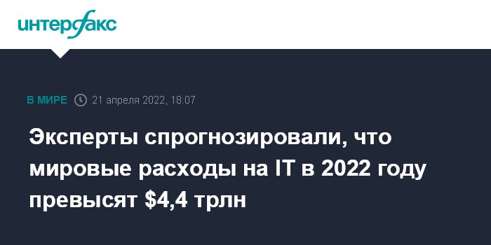Москва. 21 апреля. INTERFAX.RU - Мировые расходы на информационные технологии (ИТ) в 2022 году увеличатся на 4,4% и превысят $4,4 трлн, прогнозирует исследовательская компания Gartner Inc.