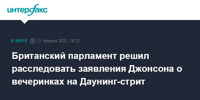 Москва. 21 апреля. INTERFAX.RU - Британский парламент проголосовал за проведение парламентского расследования в отношении заявлений премьер-министра Великобритании Бориса Джонсона о вызвавших политический скандал вечеринках на Даунинг-стрит, сообщает в четверг Sky News.