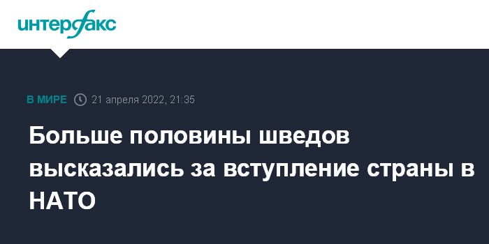 Москва. 21 апреля. INTERFAX.RU - По данным опроса института общественного мнения Novus, сторонников вступления Швеции в НАТО теперь 51% населения этой скандинавской страны, сообщил в четверг телеканал BFMTV.