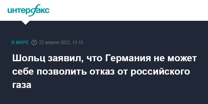 Москва. 22 апреля. INTERFAX.RU - Германия не может позволить себе ввести эмбарго на поставки газа из России, заявил журналу Spiegel канцлер Олаф Шольц.