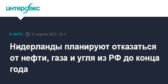 Москва. 22 апреля. INTERFAX.RU - Правительство Нидерландов объявило в пятницу о своих планах "отказаться до конца текущего года от российских нефти, газа и угля", сообщил телеканал BFM TV.