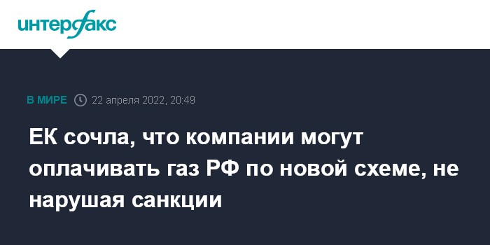 Москва. 22 апреля. INTERFAX.RU - Европейская комиссия в пятницу подтвердила, что усмотрела в предложенном РФ механизме по оплате поставок газа пути обхода санкций ЕС, но в то же время считает, что компании из ЕС и в новых реалиях могут найти законную возможность оплачивать поставки.