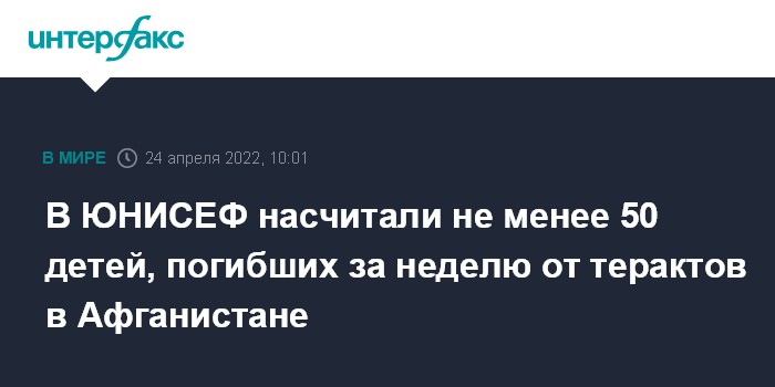 Москва. 24 апреля. INTERFAX.RU - По данным детского фонда ООН, ЮНИСЕФ, в Афганистане в результате серии взрывов в течении недели погибли не менее 50 детей.