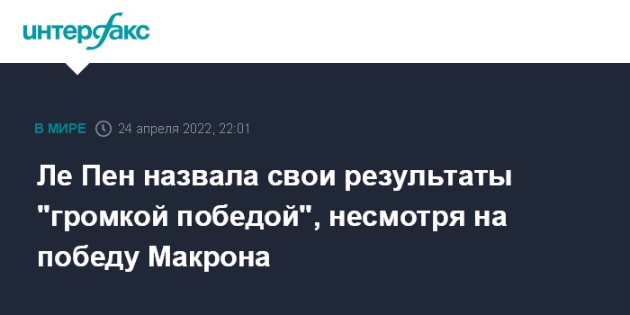 Москва. 24 апреля. INTERFAX.RU - Лидер партии "Национальное объединение" Марин Ле Пен в воскресенье после публикации французскими СМИ прогнозируемых результатов второго тура заявила, что считает результат хорошим, несмотря на поражение.