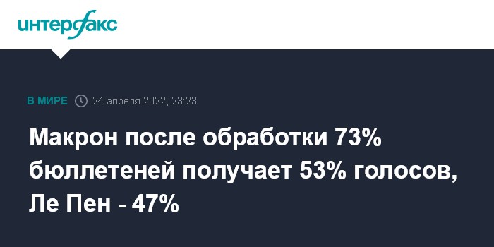 Макрон после обработки 73% бюллетеней получает 53% голосов, Ле Пен - 47%
