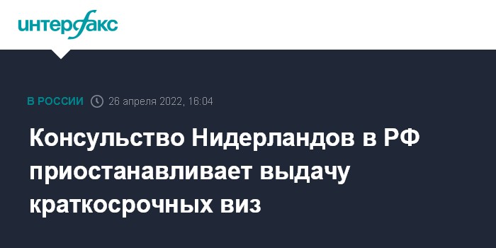 "Вследствие решения правительства Российской Федерации объявить сотрудников консульского отдела посольства Королевства Нидерландов "персонами нон грата", министерство иностранных дел Нидерландов, к сожалению, было вынуждено принять решение приостановить с 27 апреля выдачу гражданам Российской Федерации виз на кратковременное пребывание", - говорится в сообщении.